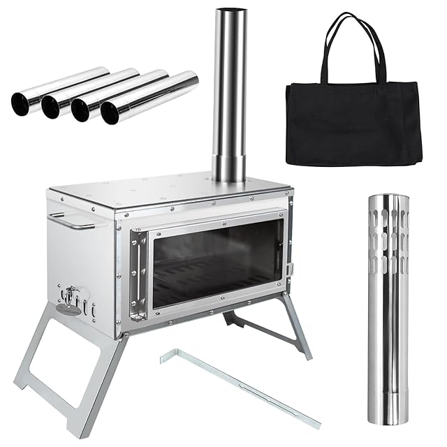 MOON LENCE 薪ストーブ 二次燃焼 耐熱ガラス窓 煙突 コンパクト キャンプストーブ テーブル暖炉 ウッドストーブ テント用 焚き火台コンロ BBQ 調理 暖炉 冬 収納袋付き