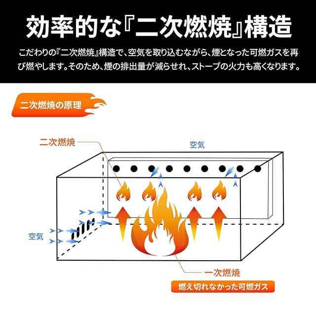 【2次燃焼ストーブ 】こだわりの『二次燃焼』構造で、空気を取り込むながら、煙となった可燃ガスを再び燃やします。そのため、煙の排出量が減らせれ、ストーブの火力も高くなります。