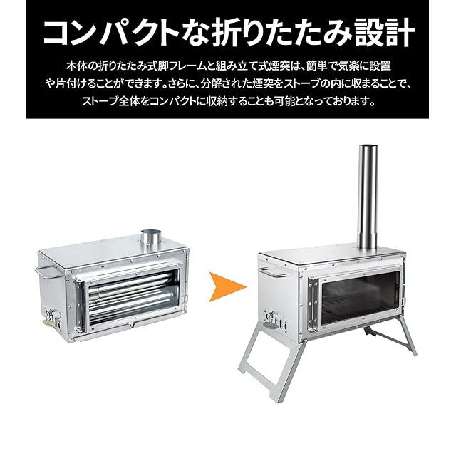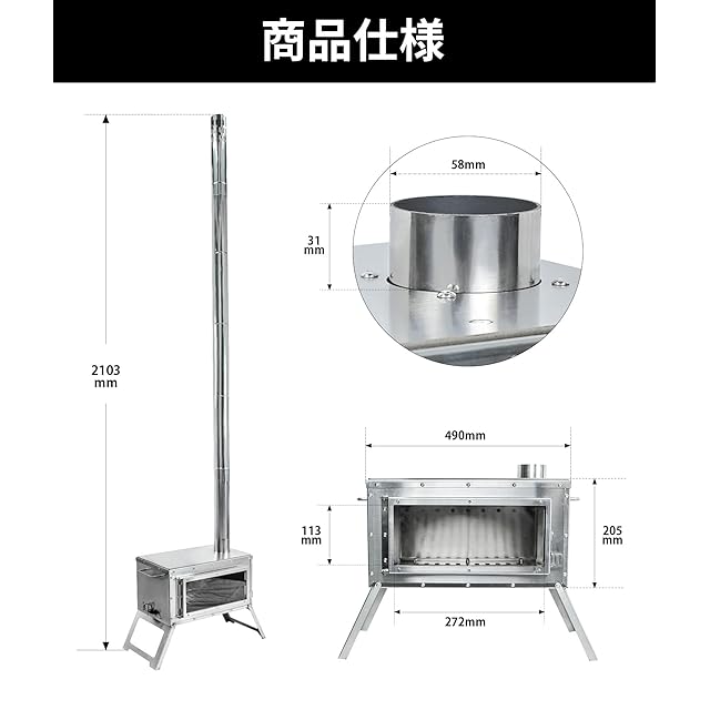 【商品仕様】●展開サイズ(約):W490mm × D205mm ×H 2103mm ●燃焼室サイズ(約):W375mm × D200mm × H170mm ●煙突パイプ:長さ329mm × 直径58mm(オス直径57mm、メス直径59mm) ●収納サイズ(約):W446mm × D225mm × H200mm ●重量(全煙突含め):8.25KG ●材質:ステンレス