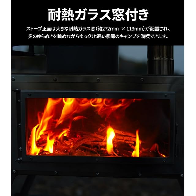 【耐熱ガラス窓付き】 ストーブ正面は大きな耐熱ガラス窓(約272mm × 113mm)が配置され、中の薪の状態を確認しやすいだけでなく、炎のゆらめきを眺めながらゆっくりと寒い季節のキャンプを満喫できます。