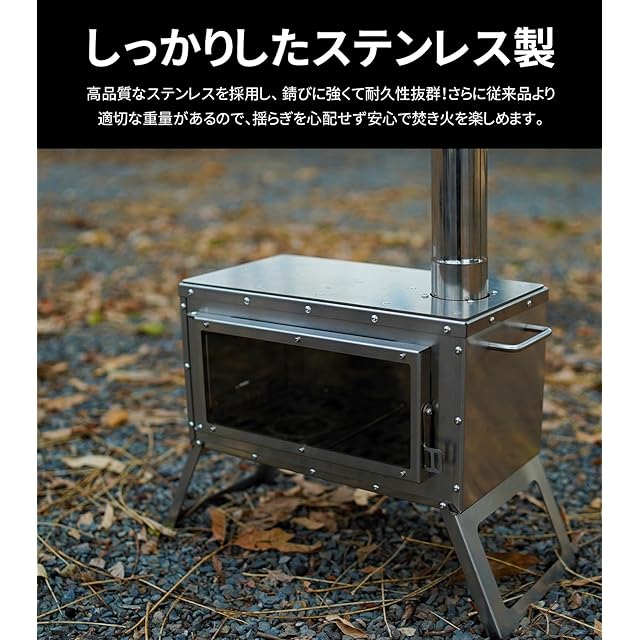 【サビに強い高品質ステンレス】MOON LENCEのキャンプ薪ストーブ本体は錆びに強く腐食しにくい耐久性抜群な高品質ステンレス製なので、 強度高く、耐熱性及び耐低温特性に優れており、どんな過酷なアウトドアシーンにも耐えるタフなストーブです。