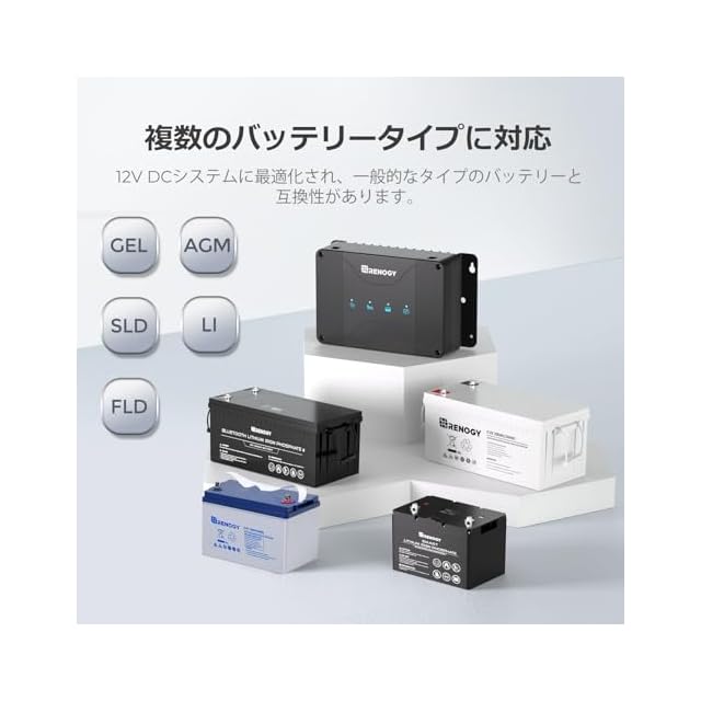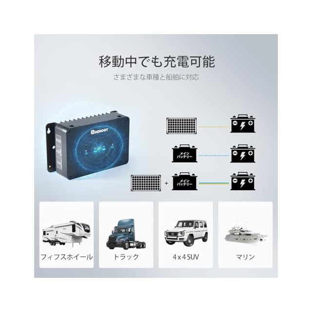 【2つ充電方式】Renogy走行充電器は、ソーラーパネル、およびメインバッテリーから2つDC入力対応できます。最大電力点追跡制御機能(MPPT)があり、太陽光発電効率を最大化することができます。