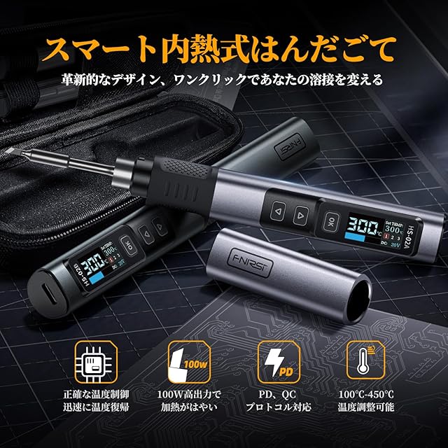 FNIRSI HS-02A ハンダゴテ 内熱式 ポータブルはんだこてキット 100W急速加熱 こて先付き 電子作業 USB給電 デジタル IPS表示 温度調節可100℃-450℃ DIY溶接ツール 持運便利 PD/QC/DC対応 半田付け 精密基盤 家電修理 スリーブ機能 キャップ付き