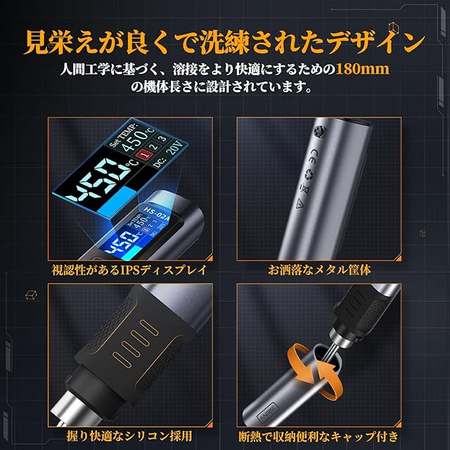 【温度制御】温度範囲100℃から450℃まで調節できるだけでなく、事前に温度セットを設定することが可能です。迅速かつ安定の温度制御、温度上昇、または温度復帰が迅速です。メタル筐体採用、見栄えが良くって、放熱性能もいい、軽くて長期間作業しても手の負担になりません