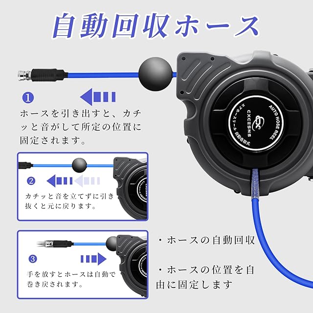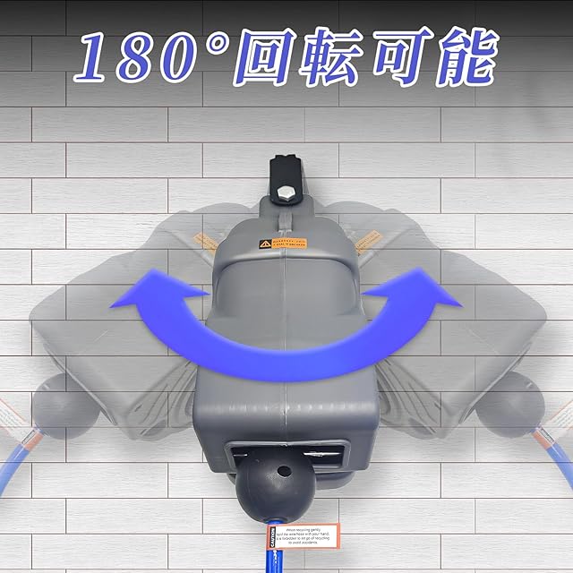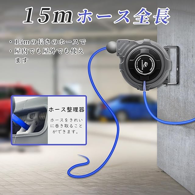 【15mのロングサイズ】ホースの全長は12メートルで、コンパクトなデザインで旅行時に持ち運びやすく、自動車修理店などの場所での使用に適しています。絡まり防止機能があり、高速で巻き取っても絡まりません。自動ロック機能により作業効率が向上します。ホースリールの長さは12メートルで屋外作業にも適しており大変便利です。