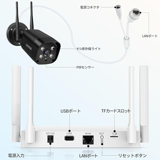 ✅{ダブルアンテナの防犯カメラ & 新登場の4本アンテナ本体} ワイヤレス 防犯カメラですので、カメラとNVRに電源を入れて、スマホアプリに追加させると、アプリで画面は映れるようになります。しかも、この防犯カメラは業界で本当のダブルアンテナチップを採用し、シングルアンテナより、ワイヤレス信号伝送距離は55%向上させます。また、アップグレードしたばかりのワイヤレス録画機に4本アンテナも付いています。安定な信号に接続し、頻繁に連絡が中断することを避け、2台接続ではほとんど遅延がなくスムーズに動いています。