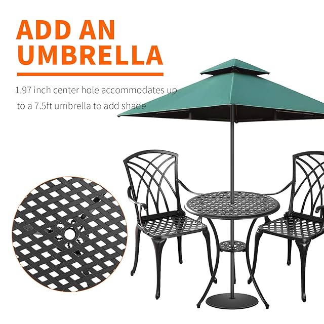 Withniture ビストロセット 3点 アウトドア、鋳造アルミニウム アウトドア ビストロセット、全天候型ビストロテーブルと椅子 2脚セット 1.97インチ傘穴付き,ガーデン用パティオビストロセットWoven Black