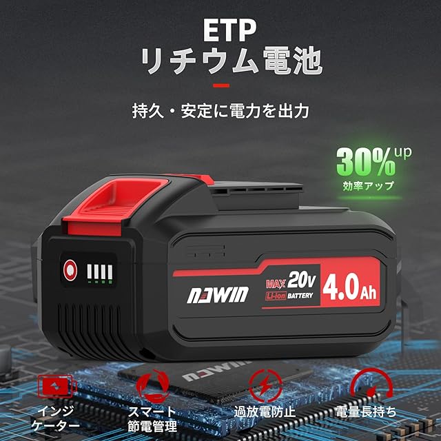 【安全ロック・誤作動を防止】誤操作による事故を防ぐため、二重安全ロック機構を採用。安全ロックボタンを押しながらでないと電源が入らない仕様なので、うっかりのスイッチONを防止できます。また、LEDインジケーター(3段階表示)で確認可能。充電切れによる作業中断を未然に防ぎ、効率的な作業進行をサポートします。