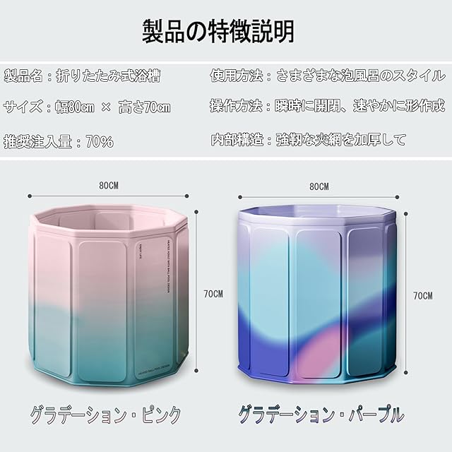 折り畳み浴槽 バスタブ 簡易風呂 浴槽 ポータブルバスタブ 浴槽 折りたたみ 水風呂 家庭用 SPA お風呂 浸漬式 大人 子供 組立簡単保温 持運び便利SPA お風呂 収納簡単 簡易バスタブ 大容量水貯蔵(グラデーション・ピンク, 70*80cm)