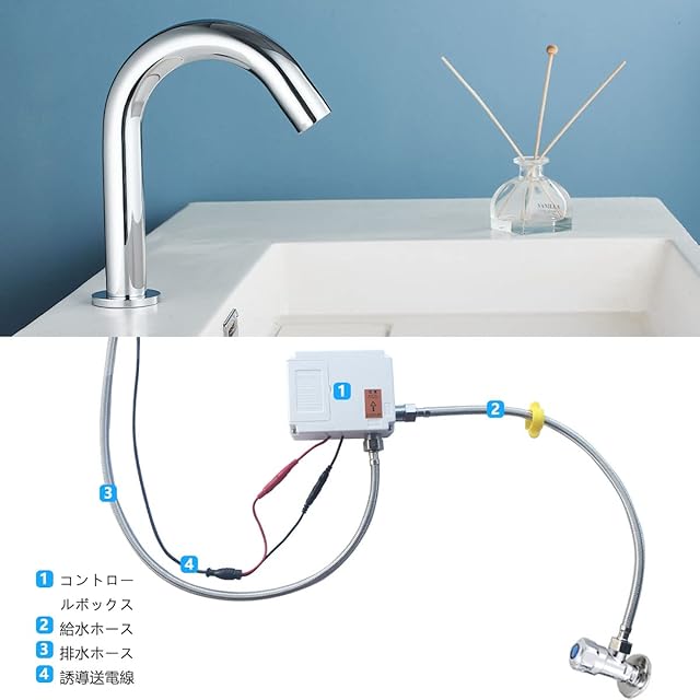 使い方: このセンサー水栓は4本の単3形電池で動きセンサーします。センサが作動すると、手が検知範囲内に入ると自動的に水が出ます。手を離せば自動で水が止まります。電池通常1年半〜2年間利用できます。電池が切れそうになったら、赤外線のランプが点滅します。一年に一回電池を交換することを提案します