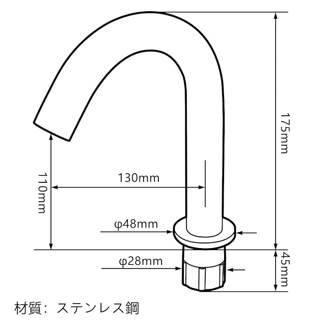 製品の説明: 素材:ステンレス。表面処理:高輝度防錆クロムめっき技術。蛇口の高さ:18cm。水栓取付穴の口径:φ25~35mm。電源:単3形アルカリ乾電池4本。水圧:0.05MPa〜0.65MPa。検知範囲:5〜10 cm。使用環境温度:0-55℃