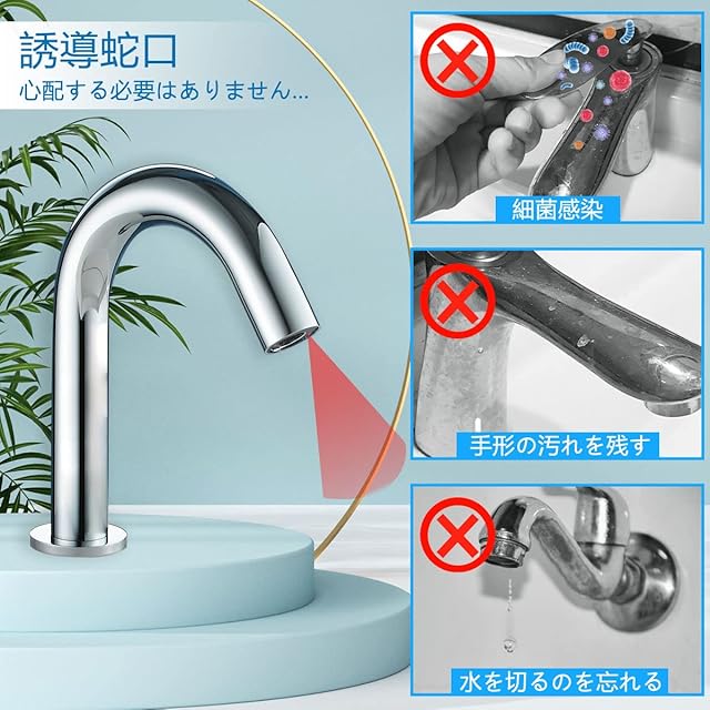 利用シーン: お宅、ホテル、トイレ、洗面所、病院、学校、レストランなど。自動センサー水栓は、蛇口に触れずに水を出したり止めたりできるので、水を流したままでの作業といった無駄を無くし、水の止め忘れも防止します。また、手を触れることがない為、清潔&接触感染対策にもなり、安心して水を使用できます。節水&清潔なのに便利になる