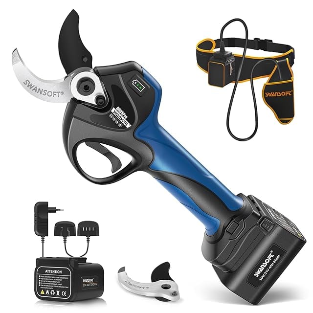 【40mm 切断径、トリガー連動機能】SWANSOFT 電動剪定バサミ、40mmの枝を簡単に切断できる、業界最大の切断径を持っています。トリガーの力で刃の開閉を制御し、より安全で効率的かつ精密な剪定作業を実現できます。8605Pro電動剪定鋏は、庭師や農園作業に最適な専門機器です