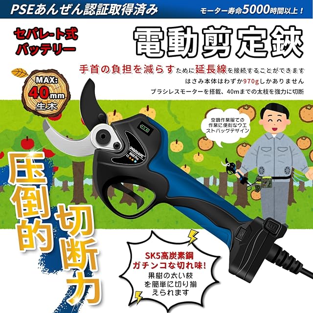 【専門レベル、耐久性と長寿命】SWANSOFT電動剪定ばさみ、1050Wの高出力ブラシレスモーターを搭載しており、硬い枝も簡単に切断でき。使用寿命は従来のブラシ付きモーターの5倍であり、PSE認証も取得しており。高枝切りロッド互換(別売り)、延長ロッドを付けると、高枝切りが楽になります。その優れた作業能力から、この電動剪定バサミは、庭木や果樹、公園緑化作業、枝の伐採や切断に欠かせないツールとなっています