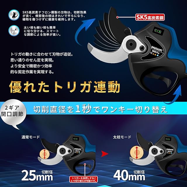 【SK5高炭素鋼】SWANSOFT充電式剪定ばさみのブレードは「SK5高炭素鋼」から鍛造されているため、切れ味が良いです。引金を長押し、ブレードの切断直径を40mmと25mmの間で切替できます