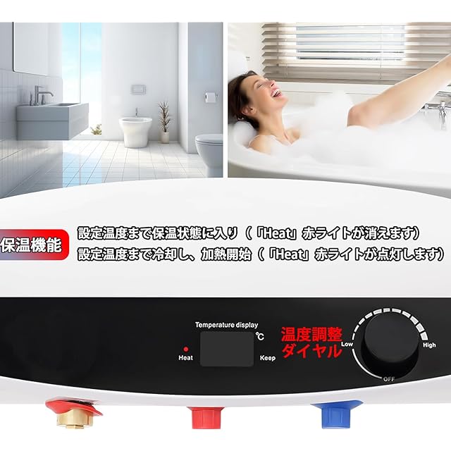 「仕様」:定格電圧:AC100~110V/50~60Hz、消耗電力:1500W、 定格水圧:0.75MPa、防水レベル:IPX4、温度:30℃-75℃ サイズ:長さ56cm*幅34cm*高さ34cm、重量:10.9KG