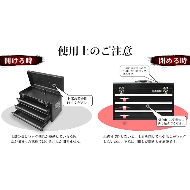 【収納・携帯便利】引き出しの数が多く、多種多様な工具を用途別に分類しながら保管できて収納力が高いです。トップカバーを閉じると引出しが自動ロック、飛び出し防止ロック機構付です。上部・側面ハンドル付きで、工具箱の持ち運びがしやすくなっています。