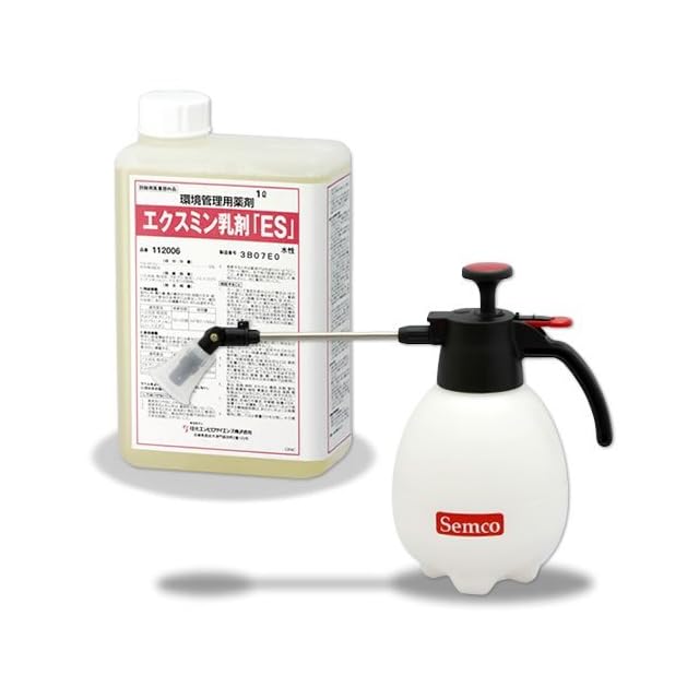 少量ボトルのエクスミン水性乳剤(1L)と小型噴霧器(2リッタータイプ)のセットです。倉庫や玄関周りなど小規模範囲の散布におすすめです。