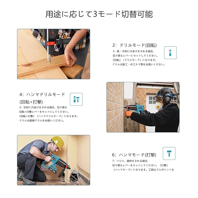 【3つモード付き】①ハンマドリルモード:石材に穴あけをされる場合、切り替え 回転+打撃レバーをセットにしてください。「回転+打撃」(ハンマドリルモード)になります。ドリルは超硬ドリルをお使いください。②ハンマモード:ハツリ、破砕をされる場合、切り替えレバーをセットしてください。「打撃」(ハンマモード)になります。工具はブルポイントなどをお使いください。③ドリルモード:鉄・木材に穴あけをされる場合、切り替えレバーにセットしてください。「回転」(ドリルモード)になります。ドリルは鉄工・木工キリ等をお使いください。