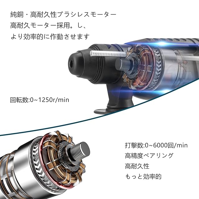 【充電式ハンマードリル】①商品サイズ:9×22×32cm ②軽量2.6 kg ③18Vバッテリー専用 ④ブラシレスモーター 搭載 ⑤ボディに2つモード搭載(ハンマードリルモード・ドリルモード)⑥最大穴開け直経:26mm ⑦穴あけ能力(mm) コンクリート:22 鉄工:14 木工:17 ⑧回転数:0-1250r/min、打撃数:0-6000回/min ⑨シャフト形状:SDS PLUS
