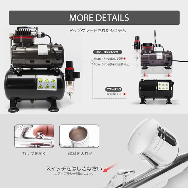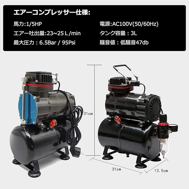☆【静音タイプコンプレッサー】馬力:1/5、電源:AC100V(50/60Hz)、エアー吐出量:23~25L/min、最大空気圧:4.0kgf/cm2、最大圧力:6.5Bar / 95Psi、騒音値:47db、電源:AC100V(50/60Hz)。自動停止機能付き。