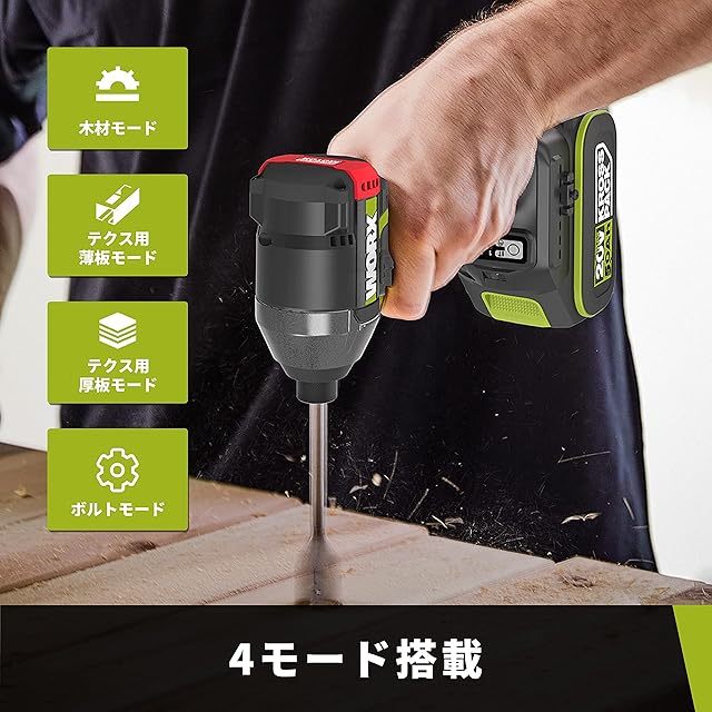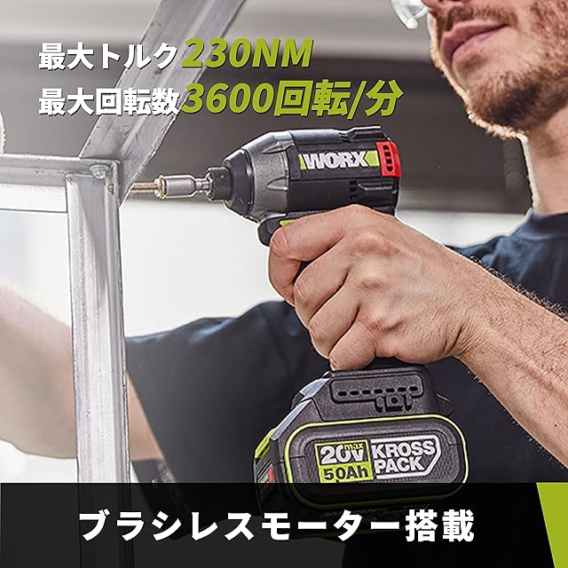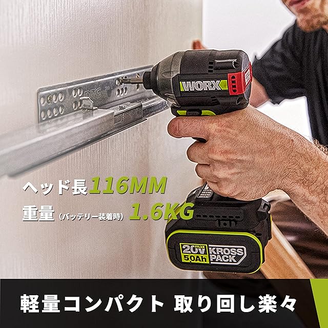WORX(ワークス)インパクトドライバー 18V(20V Max)トルク230Nm 4モード搭載 打撃モード4段階切り替え ヘッド長116mm ブラシレスモーター搭載 5.0Ahバッテリー2個、急速充電器、ビット、フック、ケース付 WU291D.3