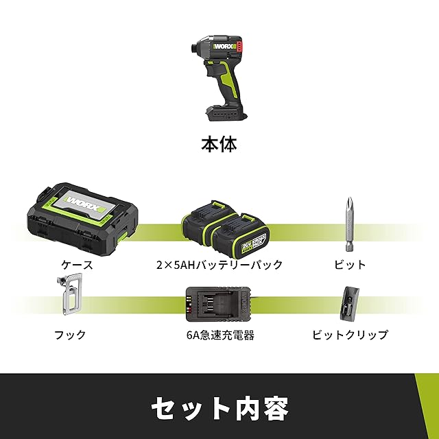 「セット内容」本体、2×5Ahバッテリーパック、急速充電器、フック、ビット、ビットクリップ、ケース