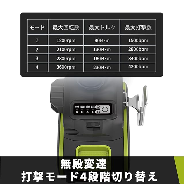 「4モード搭載+打撃モード4段階切替」4モード:木材モード、テクス用薄板モード、テクス用厚板モード、ボルトモード。打撃モード4段階切替:[モード1](低速モード):最大打撃数1500回/分、最大トルク80N.m、最大回転数1200回転/分。[モード2](中速モード):最大打撃数2800回/分、最大トルク130N.m、最大回転数2100回転/分。[モード3](強力モード):最大打撃数3400回/分、最大トルク180N.m、最大回転数2800回転/分。[モード4](最速モード):最大打撃数4200回/分、最大トルク230N.m、最大回転数3600回転/分。