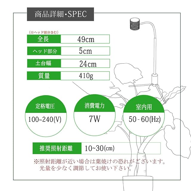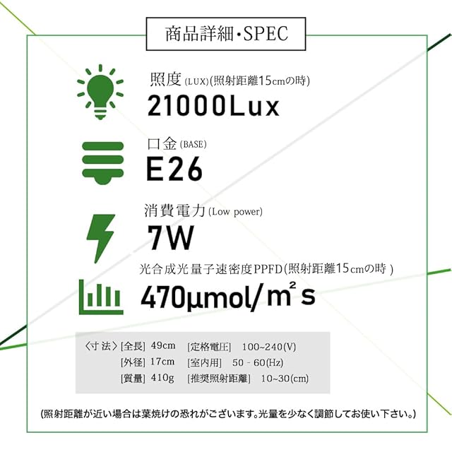 寸法 全長490mm ヘッド部分50mm 土台幅240mm 質量410g 照度(照射距離15cmの時) 21000Lux(±10%) PPFD(照射距離15cmの時) 470μmol/㎡s 消費電力(光量MAX時)7W 定格入力電流 0.3(A) 定格電圧 100~240(V) 定格寿命 20000時間 色温度 6800K ~7200K 演色評価指数 Ra97 光束角 54度 屋内用 50/60Hz ※定格寿命は設計値であり保証値ではありません。