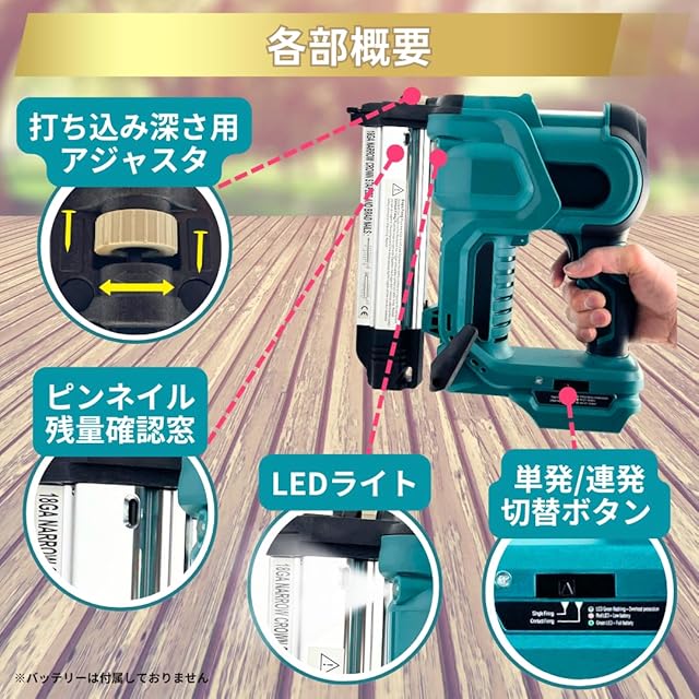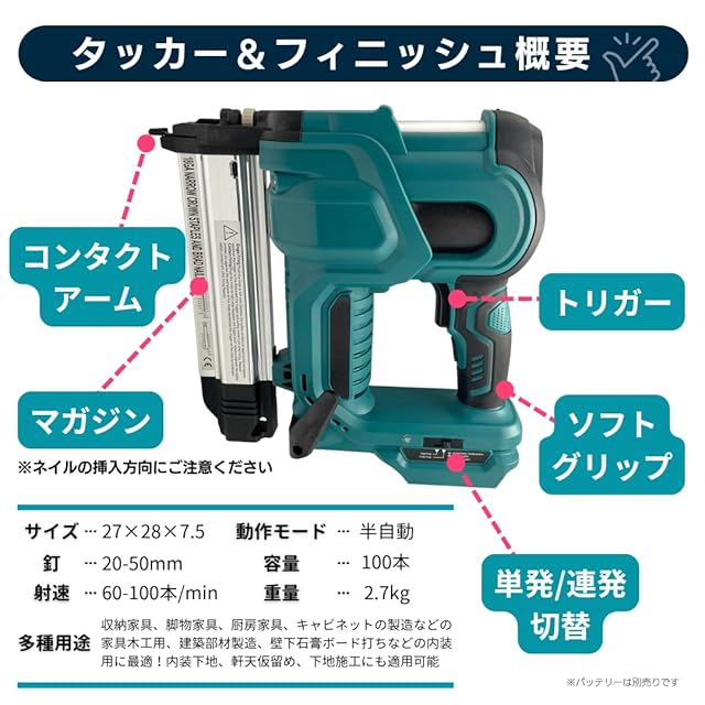 【ご注意】本製品はマキタ互換品です。バッテリー・充電器は別売となります。適合外のピン・ステープルのご使用は故障の原因となりますので、必ず適合品をお使いください。