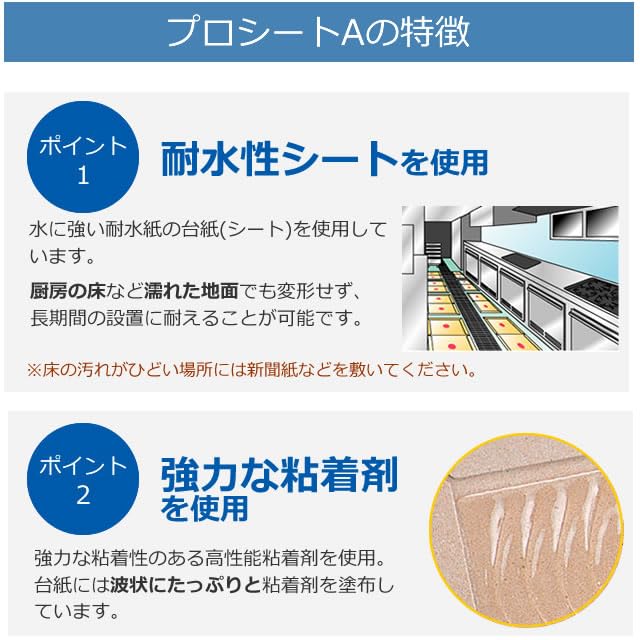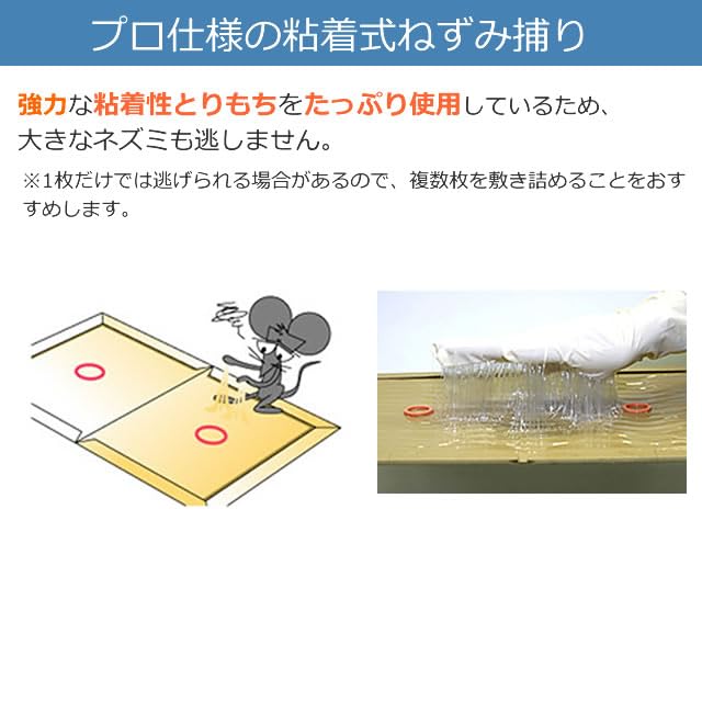プロ仕様の粘着式のねずみ捕りです。本品の台紙は、 耐水性タイプ(水に強いシート)を使用しています。水で濡れた床面でも使いやすくなっています。 ※ねずみが捕れなかったシートは、破損・汚れがひどくなければ、何回か繰り返し使用できます。回収後、再使用ください。
