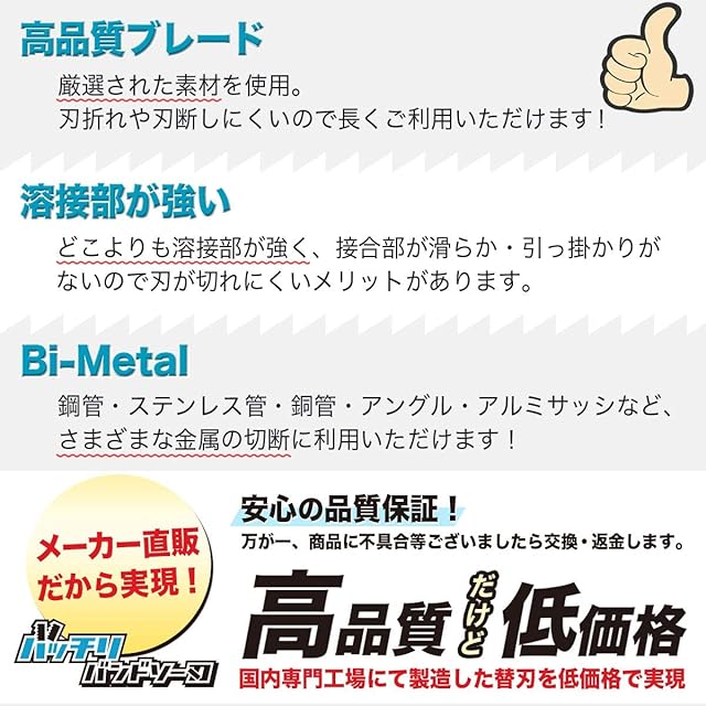 長:1140mm 幅:13mm 厚:0.5mm 入数:5本。M42コバルトハイス鋼を採用、背部には特殊バネ鋼の バイメタル構造でステンレス~鋼材まで切断可能。