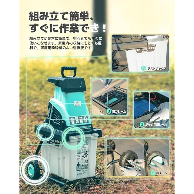 【従来の粉砕機と比較して】k50は50Lボックスを積載するためのガイドレールが改良されており、操作ミスによるガイドレールの破損はありません。 組立説明書と操作説明書付きなので、初心者でも気軽に使用できます。