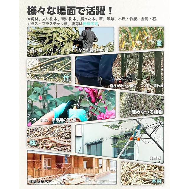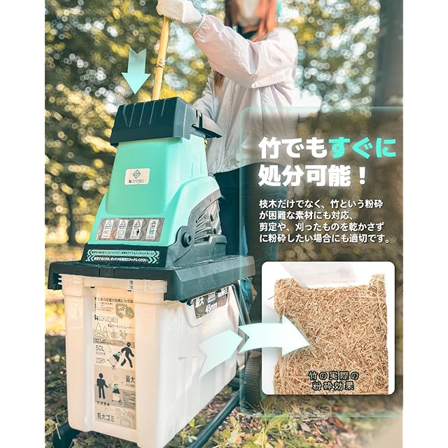 【粉砕効果】4500rpmのモーターは木の枝や竹に非常に優れた粉砕効果を発揮します。雑草、落ち葉等の粉砕効果は見込めないため、ご注意ください。 葉や雑草の粉砕に特化した新型粉砕機は、9月上旬に発売いたします。どうぞご期待ください。