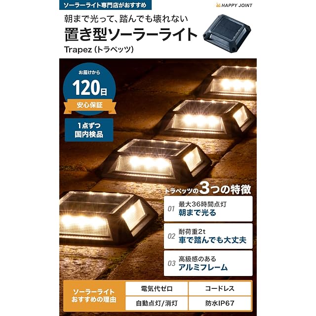 HAPPYJOINT トラペッツ4個 ソーラーライト 屋外 防水 IP67 置き型 長時間点灯 アルミ合金 耐荷重2トン