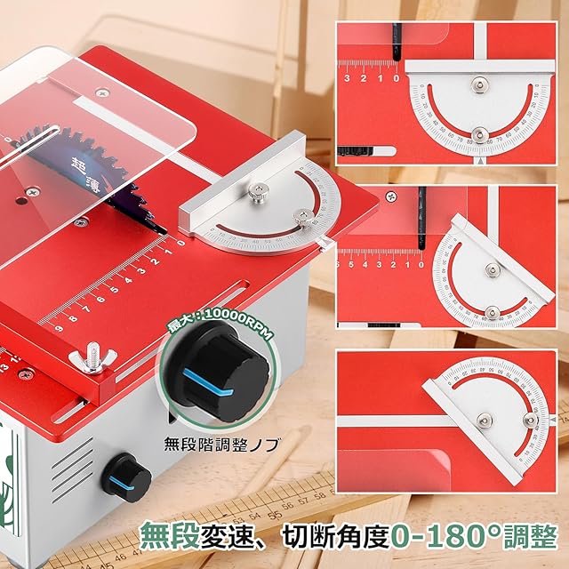 【自由に調整】無段階調整ノブを装備し、作業速度を自由に調整できます。初めて使用する場合は、調速器の速度を最大にしてください。(切断モーター:10000RPM 鋸刃:5000RPM 研削モーターとドリル:6000RPM) マイターゲージーは0-180°調節可能、多角度切断を実現します。さまざまな切断材に応じてご希望のように調整します。