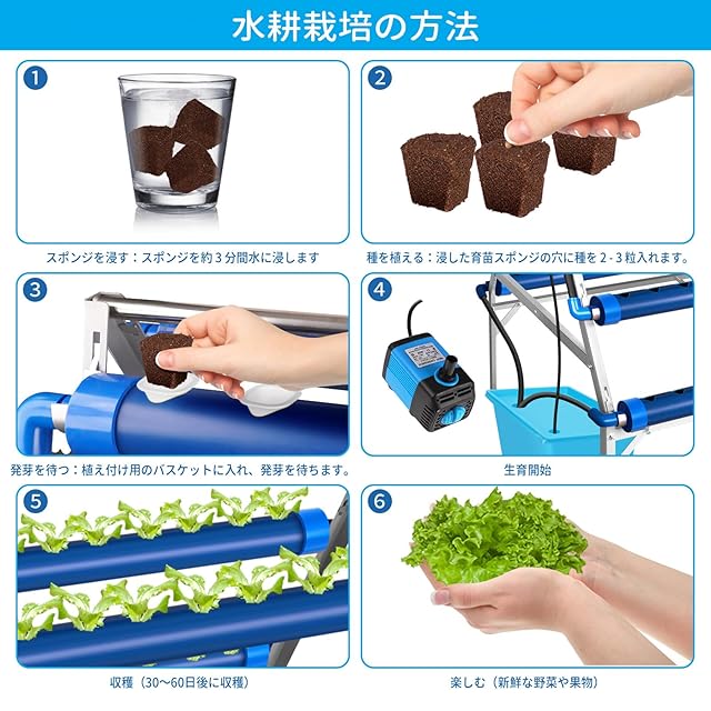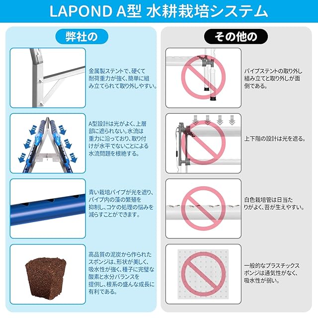 【A型 水耕栽培システム】LAPOND A型 水耕栽培が金属製ステントで、硬くて耐荷重力が強く、簡単に組み立てられて取り外しやすい!A型設計は光がよく、上層に遮られず、植物の光がより十分に照らされるようにしています!青いパイプと黒いホースをアップグレードし、藻の繁殖を抑制!高品質の水耕栽培スポンジをアップグレードし、強い通気性、発芽率を向上させる!弊社の水耕栽培システムは新鮮な果物や野菜を栽培するための独特な方法を提供しており、土壌を必要とせず、屋内でも屋外でも、ベランダ、庭、自宅などさまざまな場所で栽培することができます。初心者に優しく、必要な付属品がすべて揃っているので、簡単に組み立てて使用することができます。種、養液、バケツを用意すれば、すぐに栽培を楽しむことができます!
