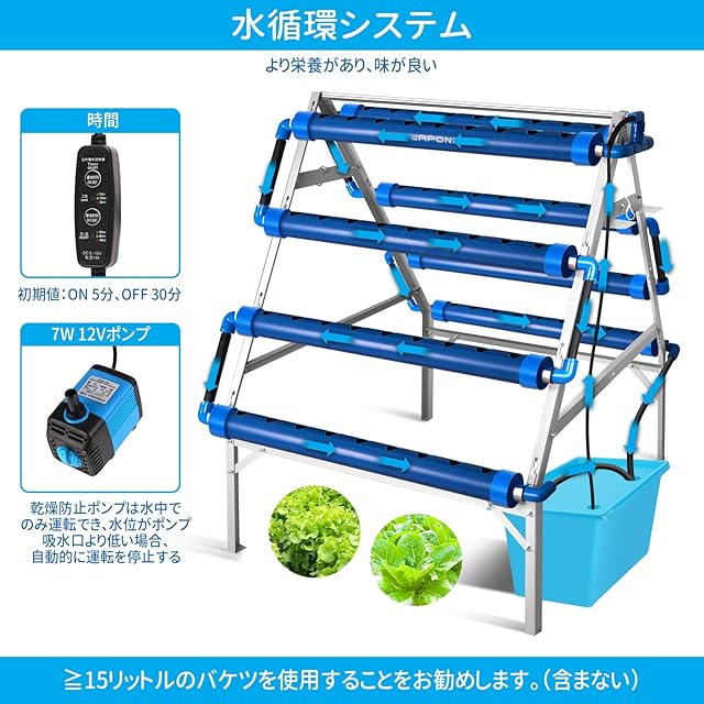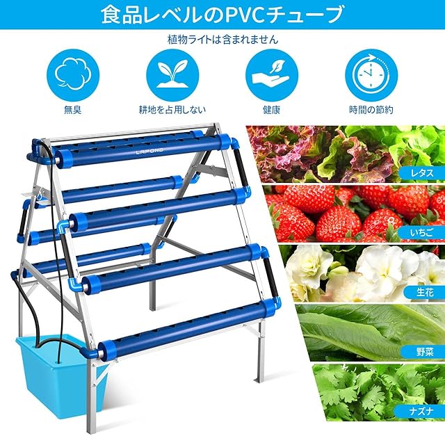 LAPOND 水耕栽培システム A型 青い食品級PVC-U管水耕栽培キット 72穴 水耕栽培植物用 自動水循環システム搭載 藻の繁殖を抑制 水耕栽培野菜/果物/ハーブ/花など 家庭菜園 室内 ベランダ 庭 (日本語説明書付き)