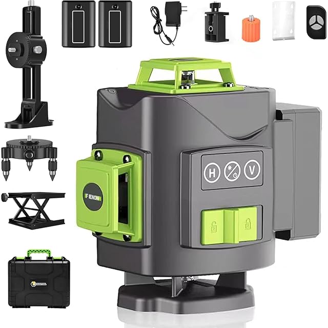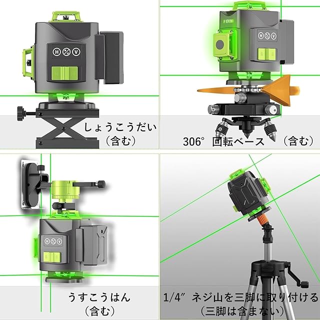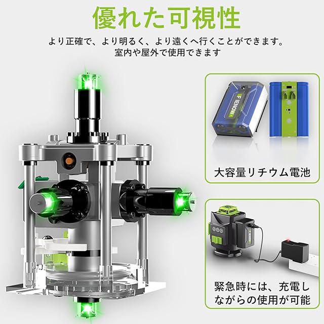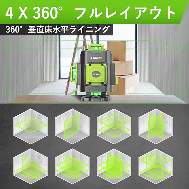 4x360° レーザー墨出し器 グリーンレーザー墨出し器「Fienow 2024年改良墨 出し レーザー+全パーツセット」レーザー墨出し ツール 30m作業範囲-レーザー墨出し器、 ビルドとアライメント用、充電式リチウムイオン電池2本搭載(最大20時間稼働)レーザー安全基準:クラス2