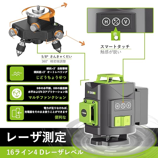 【16ライン・4x360°高精度レーザー墨出し器】: 当社レーザー墨出し器は、高精度、視認性の高い16ライン・4x360°を実現します。作業を効率化し、最高の精度を提供します。