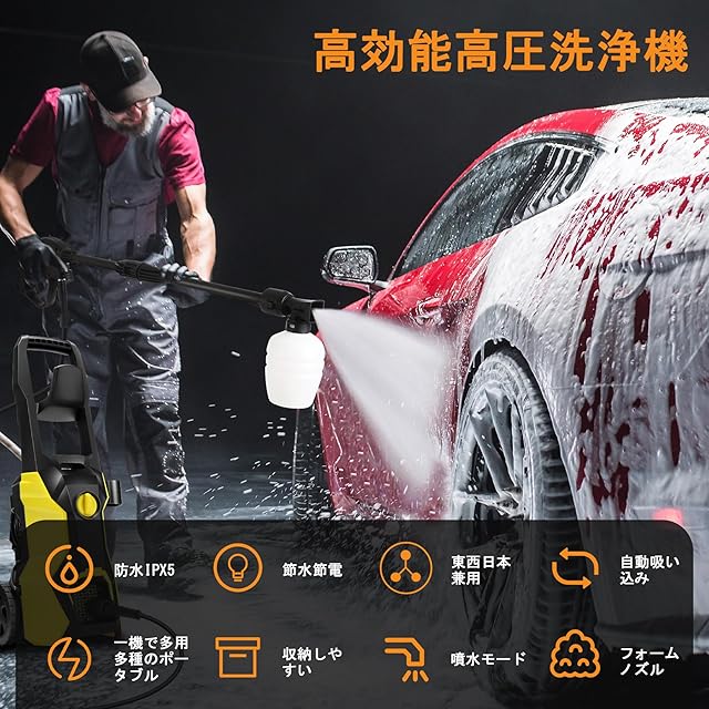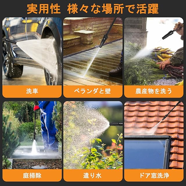 ✔【 ❗多機能使用❗ 】普段使いの洗浄にバリオスプレーランス対象物や汚れ具合に合わせ、低圧から高圧まで水圧を調節することができます。頑固な汚れの洗浄にサイクロンジェットノズル広角ノズルでは取りにくいコケや頑固な汚れも、きれいに剥ぎ取ることができます。洗浄しにくいところは180°変換ノズルが。角度を変えて届きにくい場所の汚れにも。洗浄剤を泡状噴射!洗車にフォームノズル専用ノズルによって洗浄剤を上手に泡立て、効果的に汚れを落とすことができます。