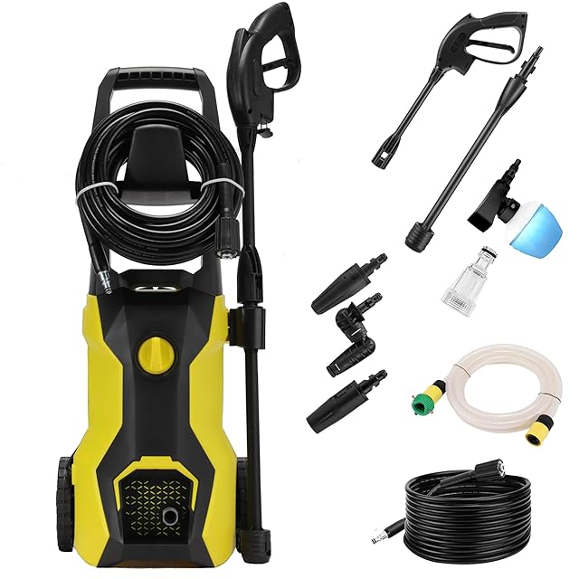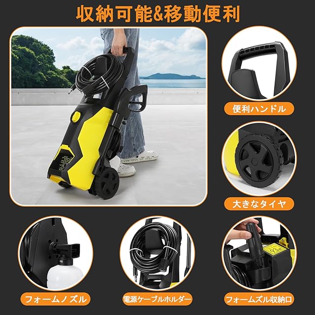✔【 ❗収納可能&豊かなセット❗ 】本体重量はたったの7.5kg、女性が持ち運んでも負担にならない軽さ。セット内容:日本語取扱説明書、トリガーガン1個、バリオスプレーランス1個、サイクロンジェットノズル1個、フレキシブル可変ノズル1個、コードボルダー1個、ハンドル1個、高圧ホース10m、電源コート5m、水道ホース3m、クリーニングピン1個、給水コネクタ、交換用リング、ネジ。※アクセサリが多種類なため、商品を受け取ったら、ぜひチェックしてください。もし何か足りないとしたら、全て無料でお送りいたします。