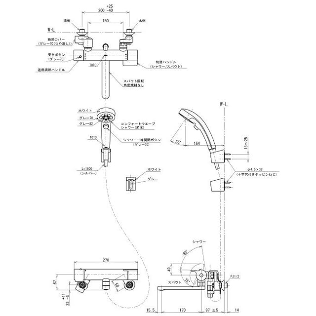 TOTO 浴室用 壁付サーモスタット混合栓 コンフォートウェーブクリックシャワー 一般地向け TBY01403J シルバー