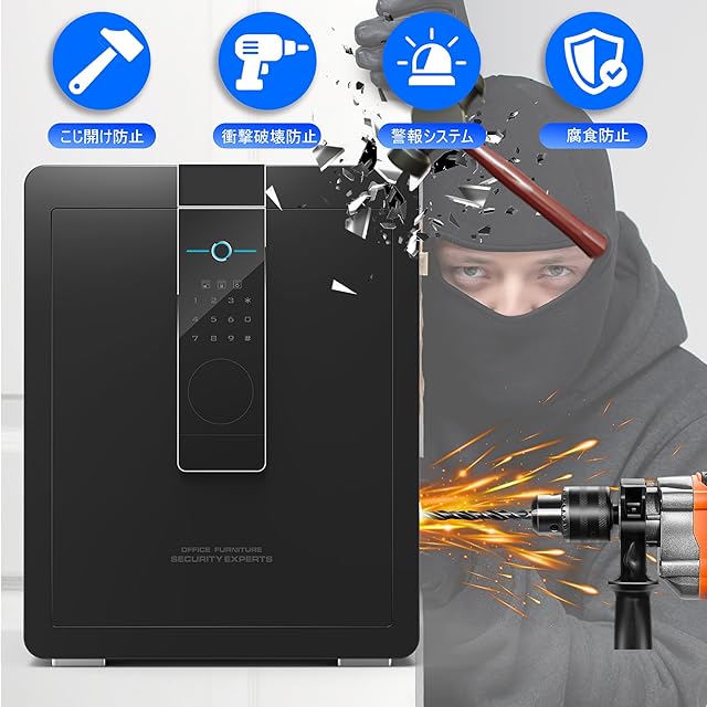 【頑丈な五重セキュリティ保護】 (1)硬鋼材料、破壊防止の高硬度の素材を採用し、破壊や切断されることを防き、お客様の貴重品は大切に保管できます。 (2)ハンドルノブには最新の技術を採用し、乱暴な開錠を防止し、安心してご使用できます。 (3)こじ開けを防ぐための合金鋼強化ドーア、防犯性もアップさせます。 (4)金庫は超長い楕円形のロックボルトを備えており、全鋼製の防犯強化されたロックボルトは、扉内にしっかりと嵌まり、多次元の撬り防止を実現します。(5)金庫が激しく揺れたり、パスワード入力が5回間違ったりすると、セキュリティアラームが1分間トリガーされます。