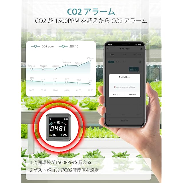 【スマート CO2 アラート】1500ppm を超えると、自動的にアラームが鳴り、必要に応じてさまざまなアラーム範囲を設定することもできます。 CO2 が事前に設定された範囲を超えると、すぐにアラートが届きます。 寝室、ベビールーム、ワインセラー、地下室、植物の苗床、その他のエリアの状態を把握します。