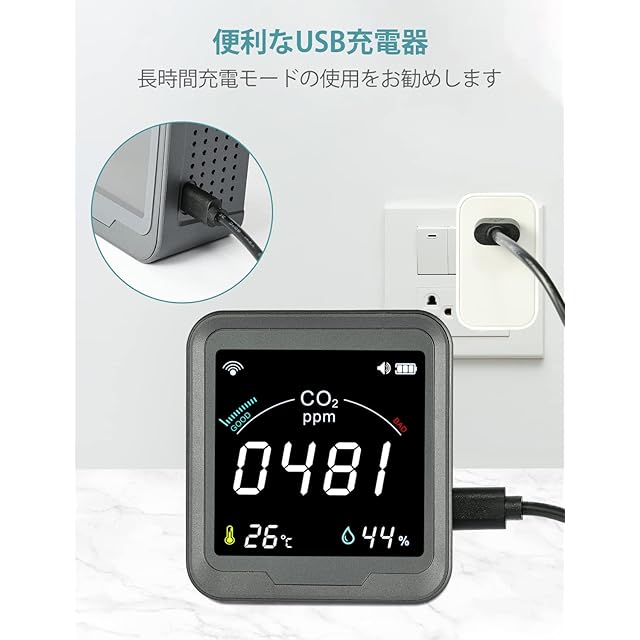 【大容量充電式バッテリー】CO2検出器には大容量充電式バッテリーが内蔵されており、最大40時間待機します。 どこからでも空気の状態を確認したり、特定の場所で継続的に監視したりできます。