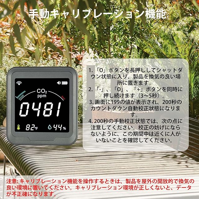手動キャリブレーションのセットアップ手順: 1. 「O」ボタンを長押ししてシャットダウン状態に入り、製品を換気の良い場所に置きます。2. 「-」、「O」、「+」ボタンを同時に押し続けます(3〜5秒)。3. 画面に199の値が表示され、200秒のカウントダウン自動校正状態になります。4. 200秒の手動校正状態では、次の点に注意してください。校正の妨げにならないように、この期間中は近くに人がいないことを確認してください。注意: キャリブレーション機能を操作するときは、製品を屋外の開放的で換気の良い環境に置いてください。キャリブレーション環境が正しくないと、データが不正確になります。