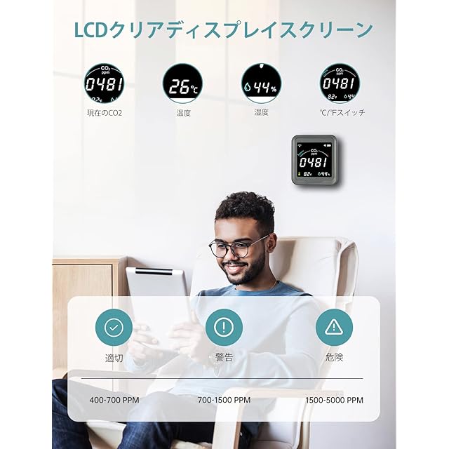 【CO2 濃度段階】この CO2 検出器は、CO2 濃度の 3 段階 (通常段階 (400 ~ 700 ppm)、警告段階 (700 ~ 1500 ppm)、危険段階 (1500 ~ 5000 ppm)) で設計されています。 LSENLTY スマート CO2 検出器は、よりスマートな健康生活を提供します。