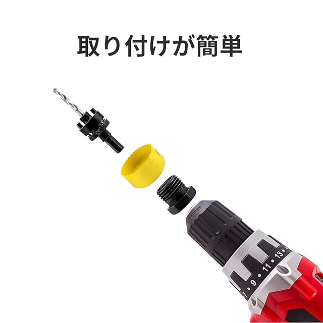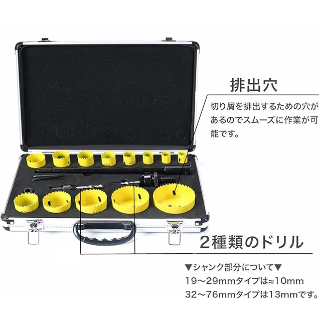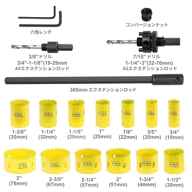 ホールソーセット配置丰富:ホールソー×13、ドリルビット×2、300mmエクステンションバー×1、六角スパナ×2、変換ナット×1、キャリングケース×1