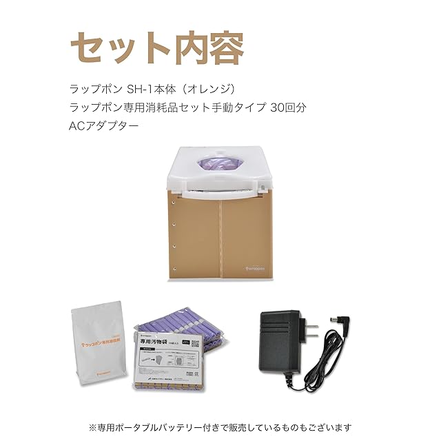 セット内容:ラップポンSH-1本体(便座ユニット、胴体、台座)、専用消耗品セット30回分(汚物袋、凝固剤)、ACアダプター ※本製品の価格には送料が含まれています